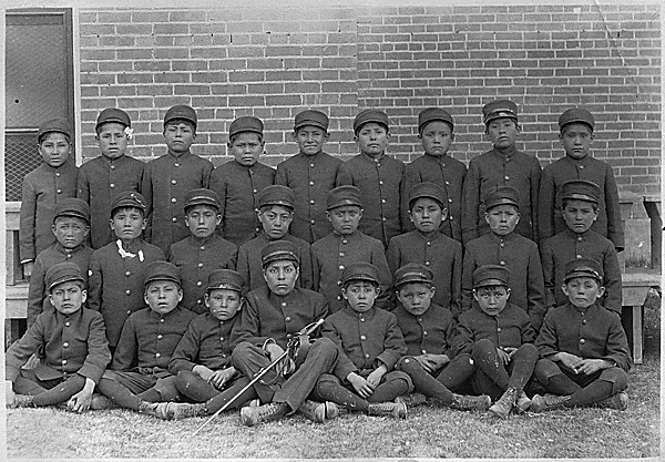Class of younger boys in uniform at the Albuquerque Indian School. (Photo courtesy National Archives and Records Administration)